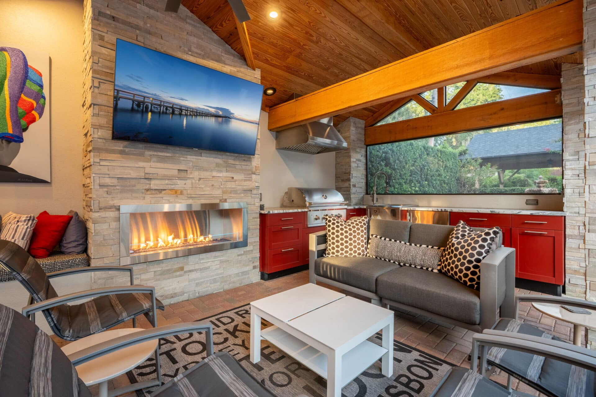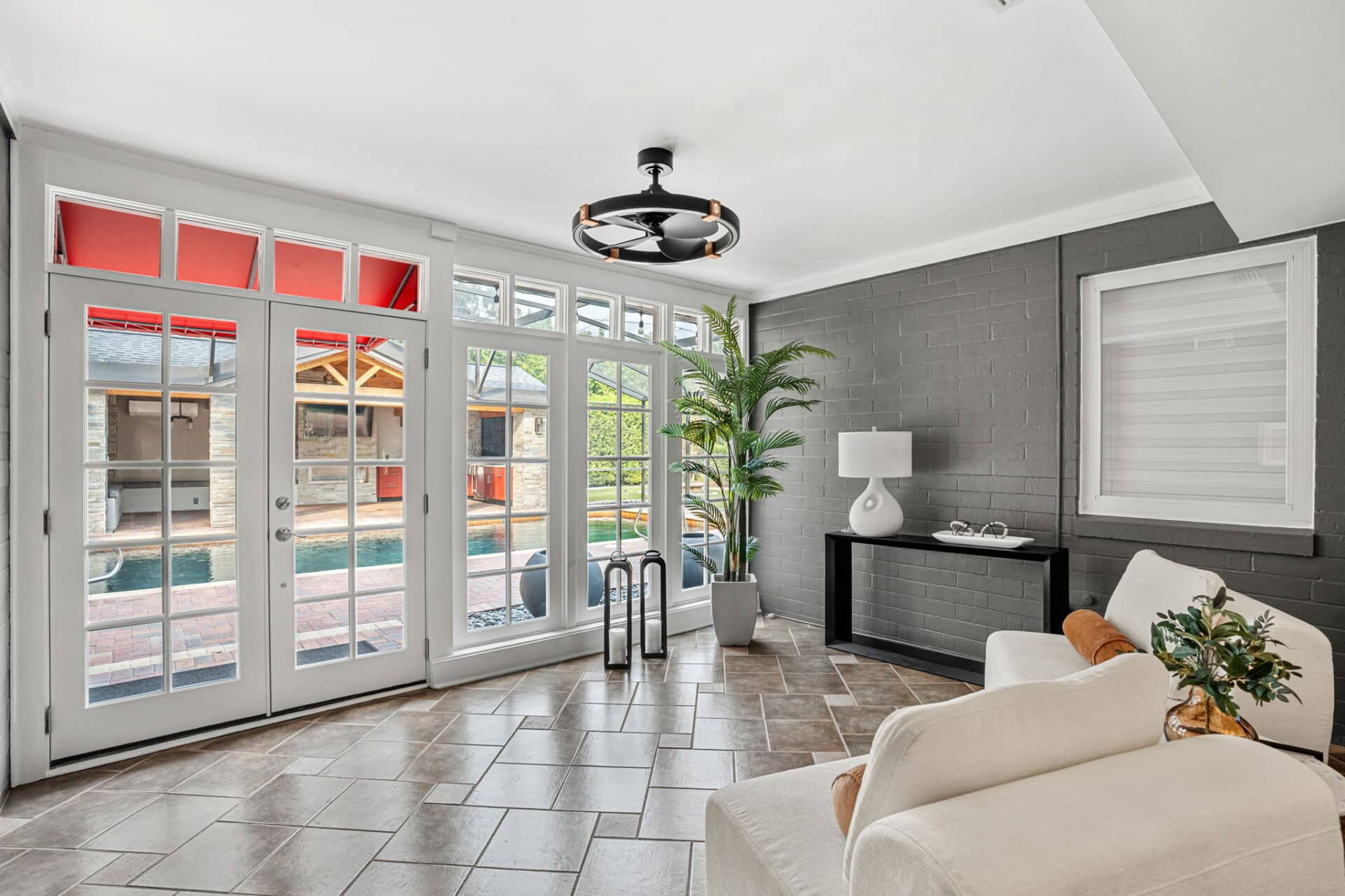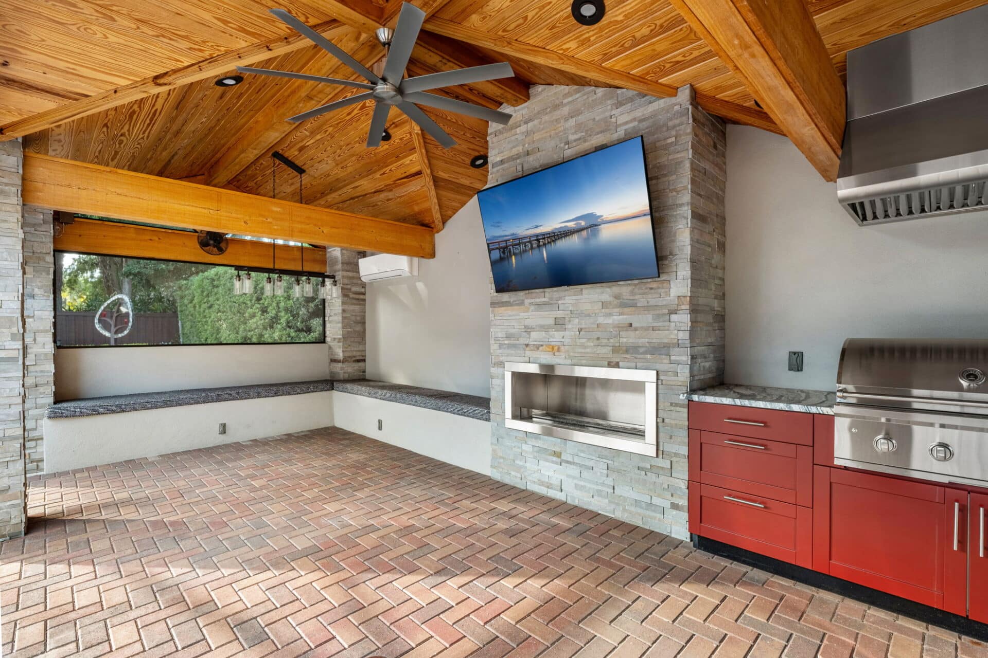 But the true showstopper lies beyond the back door: over 1,800 sq. ft. of fully screened outdoor living space, anchored by a 365 sq. ft. cabana with its own outdoor A/C system, a full outdoor kitchen, and seating for eight at the dining table. Gather around the outdoor fireplace with a TV mounted above perfect for game days, holiday movies, and evenings spent with friends.