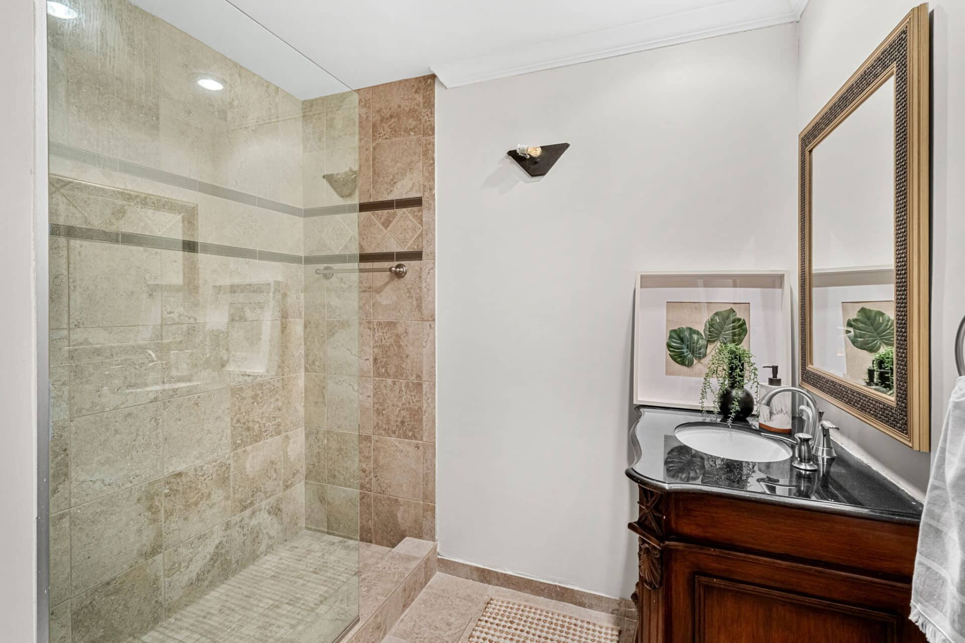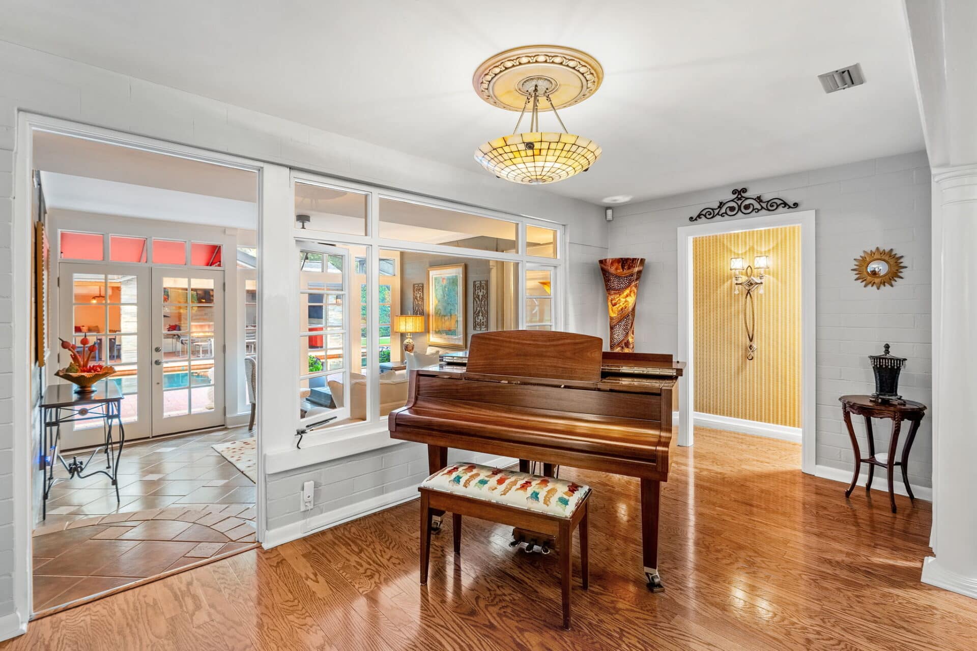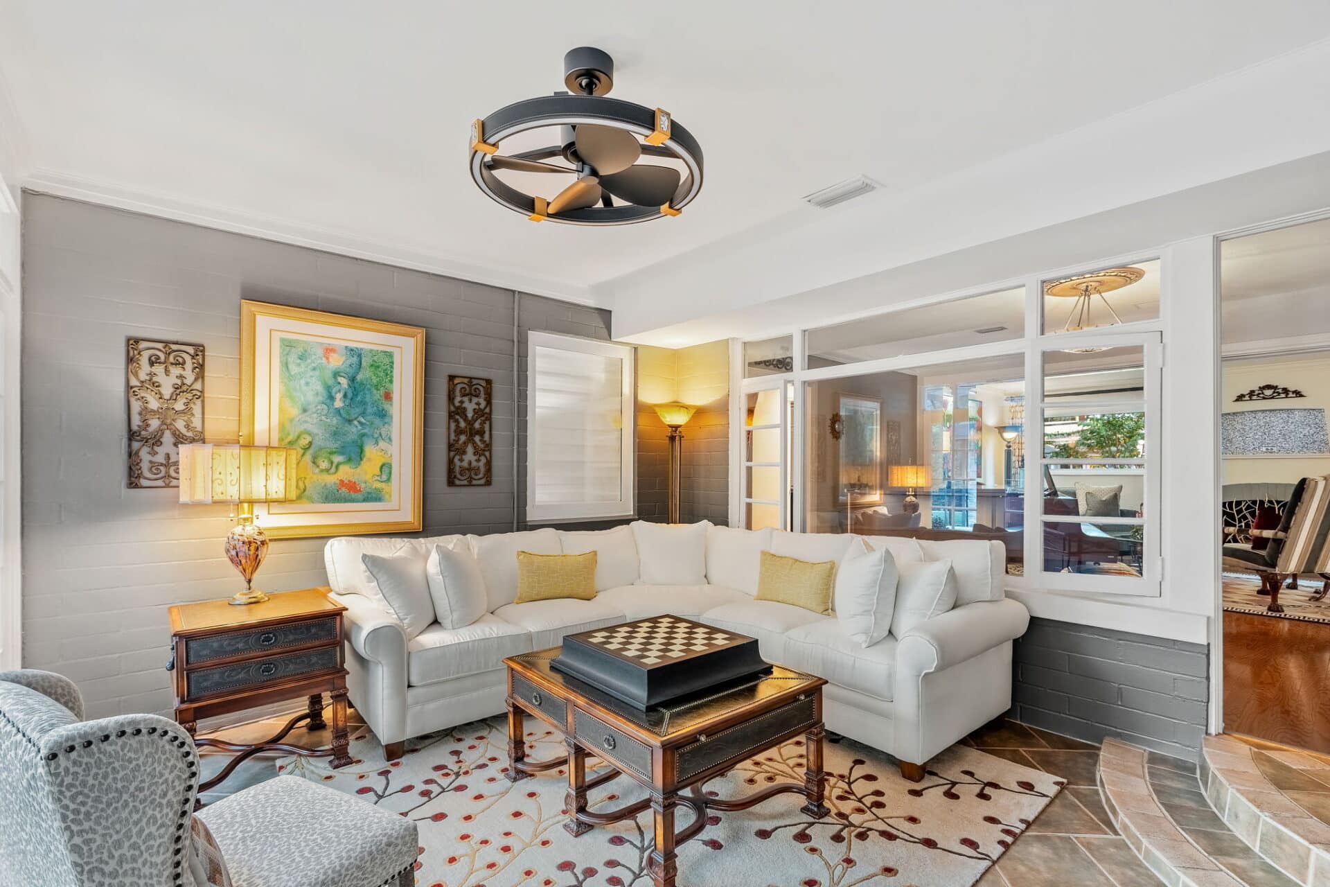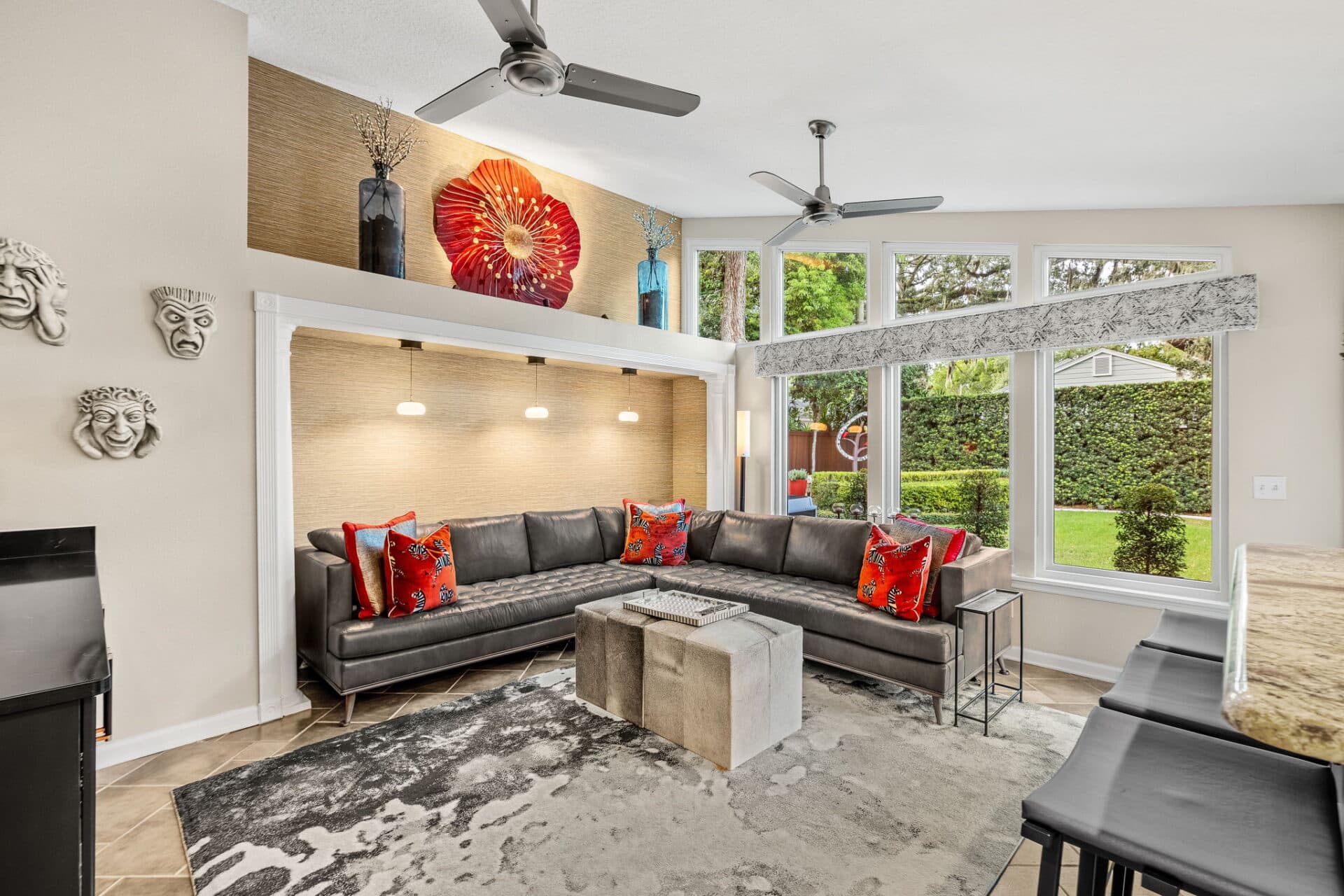 But the true showstopper lies beyond the back door: over 1,800 sq. ft. of fully screened outdoor living space, anchored by a 365 sq. ft. cabana with its own outdoor A/C system, a full outdoor kitchen, and seating for eight at the dining table. Gather around the outdoor fireplace with a TV mounted above perfect for game days, holiday movies, and evenings spent with friends.