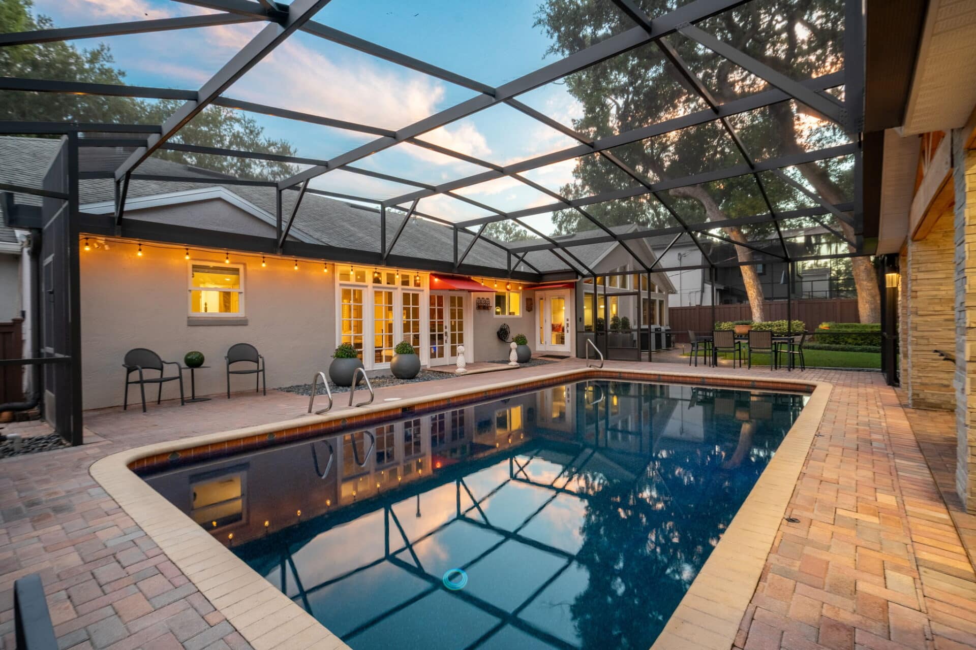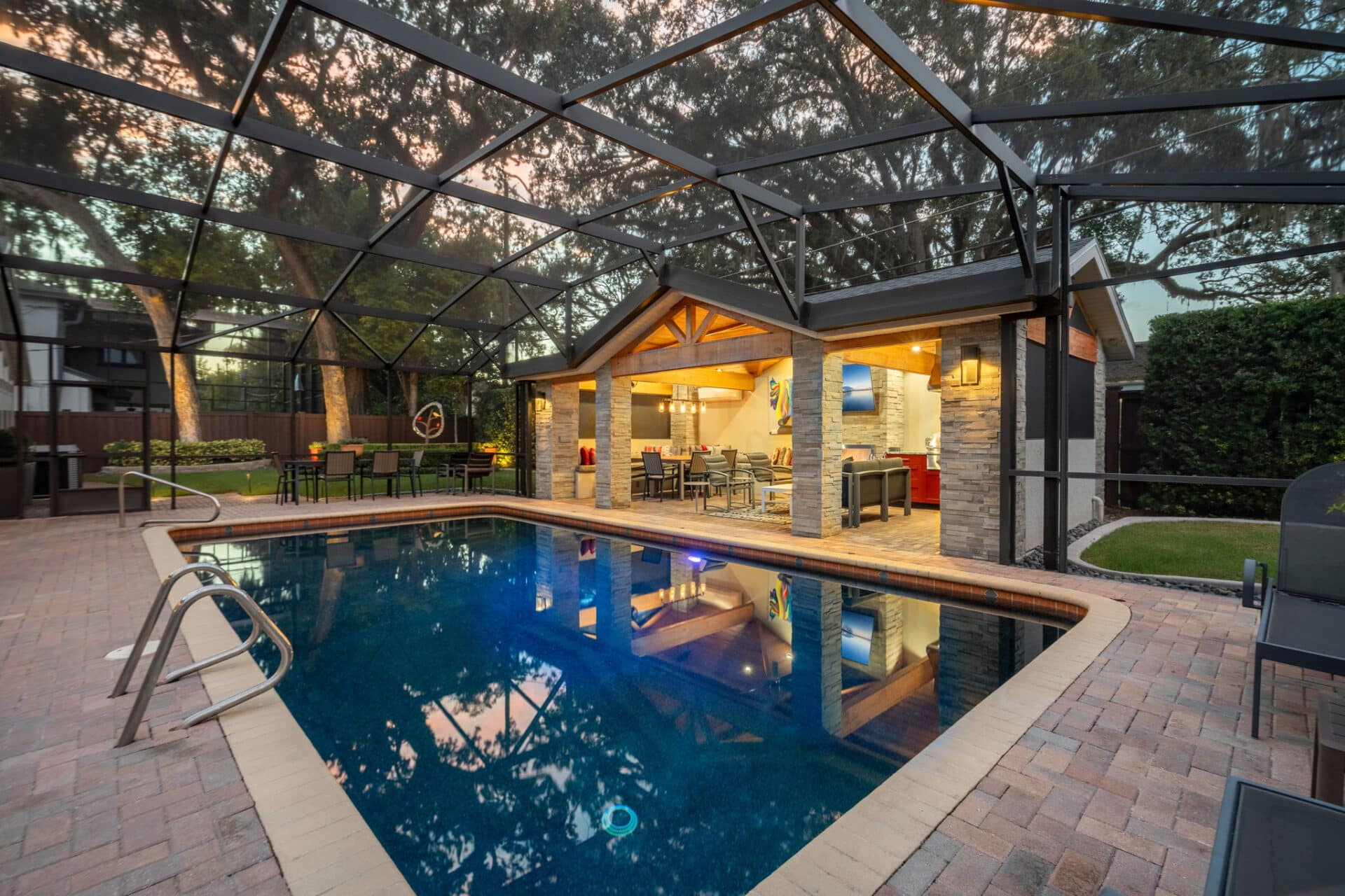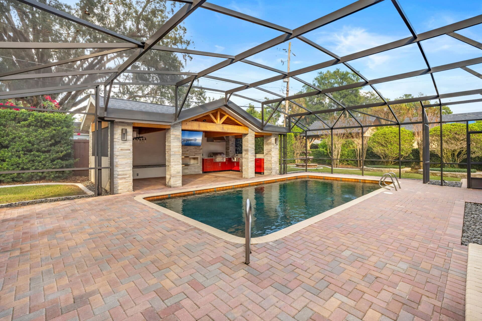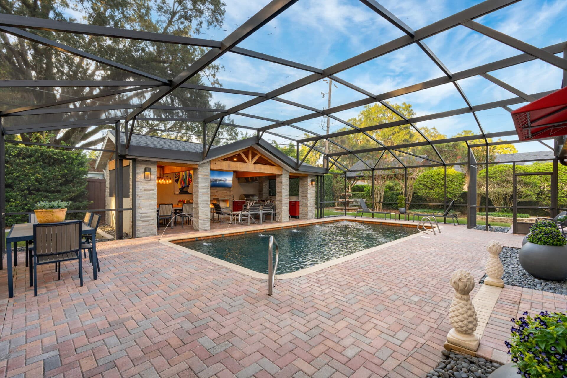 Beyond the cabana, you’ll find a massive Pebble Tec pool (12 ft deep!) and plenty of yard space to create
